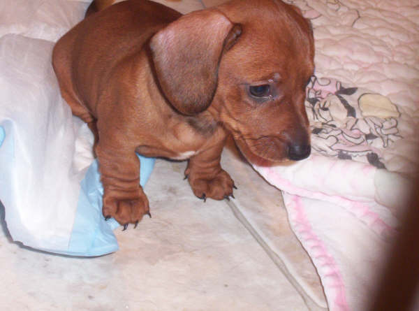 Hi, I am a smooth, red weenie pup. My mom is Scarlett."