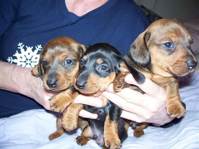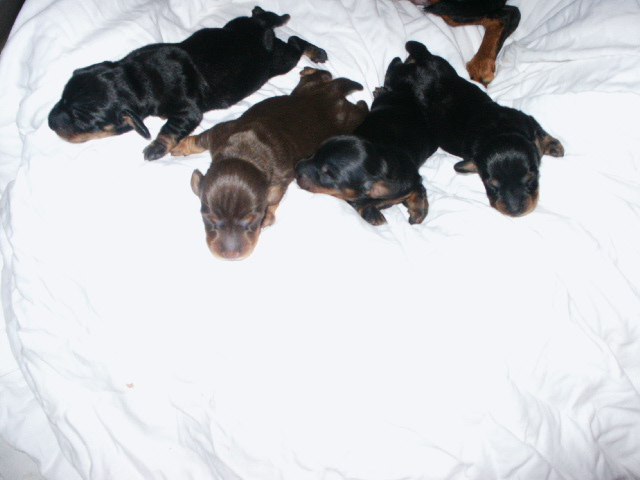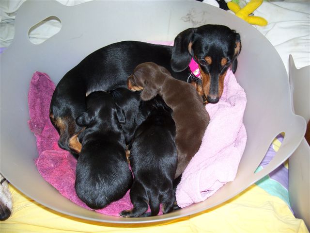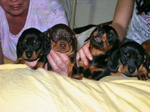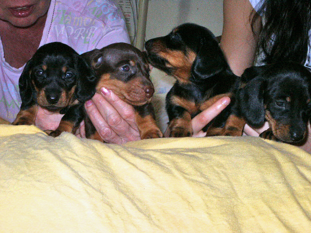 This is Fiona (mommie) and her four pups born on 12/06/09. They are two weeks old here. These are smaller, miniature, smooth dachshunds with GREEN eyes and liver noses.